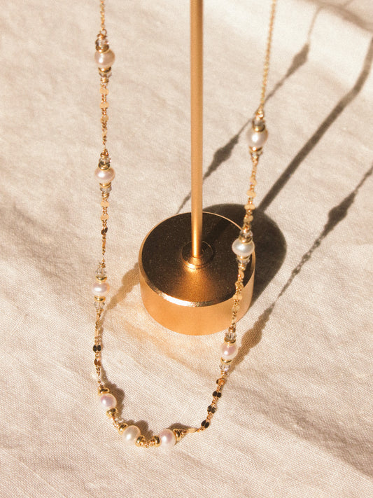 Florence Necklace, White Round Pearl and Dapped Bars, 14K Gold Fill