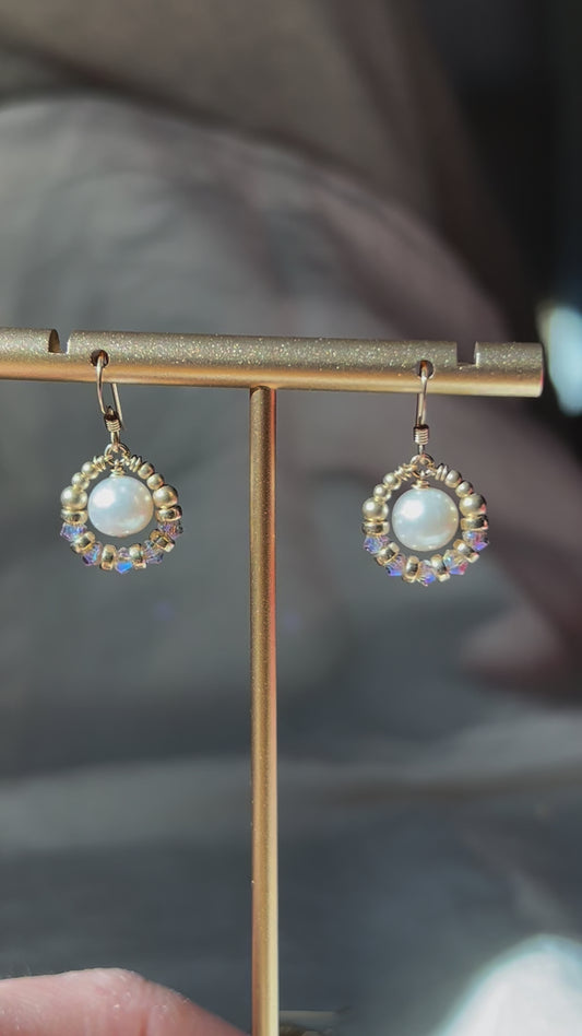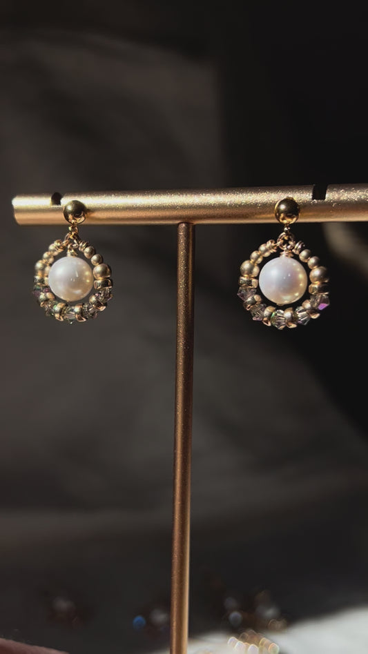 Suila Earrings with White Round Pearl and Mystic Lavender Swarovski Crystal, 14K Gold Fill