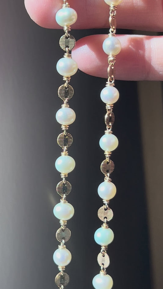 White Pearl and Textured Coin Link Choker Necklace, 14K Gold Fill