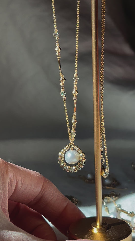 Suila Necklace with White Round Pearl and Muted Silver Green Swarovski Crystal, 14K Gold Fill