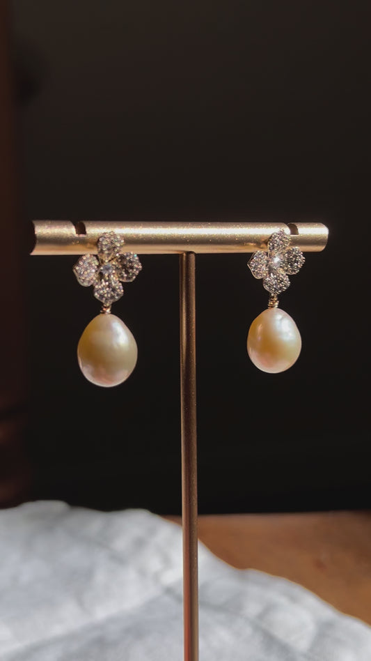 Flower Cubic Zirconia Pavé Post Earrings with Peach White AAA Edison Pearl, 925 Sterling Silver Post