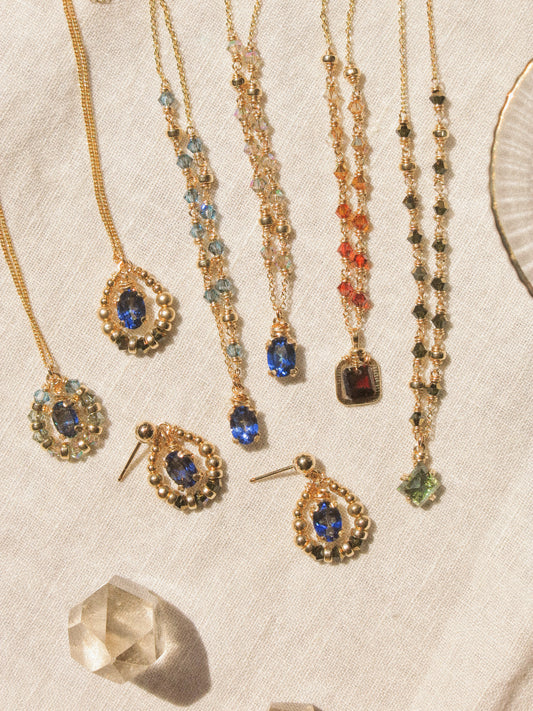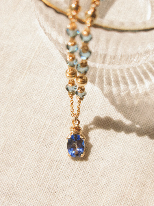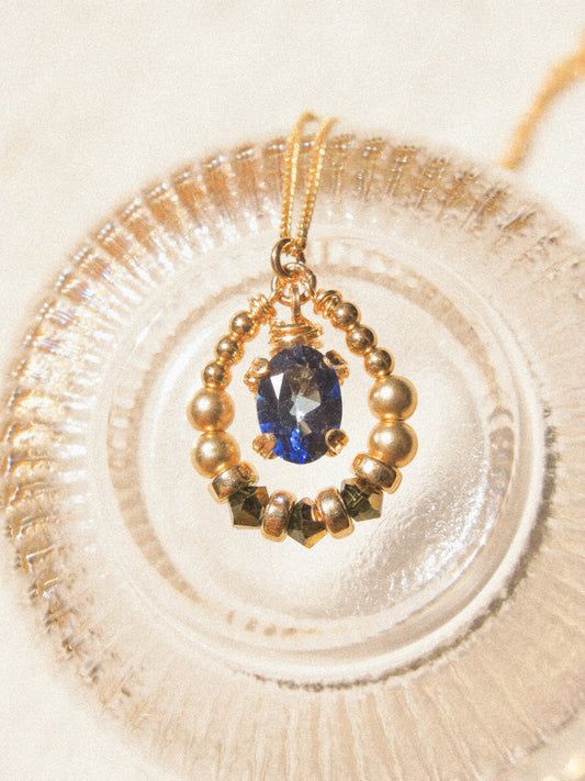 Suila Necklace #1 with Faceted Blue Topaz in Prong Setting with Beaded Frame in Swarovski Crystals, 14K Gold Fill