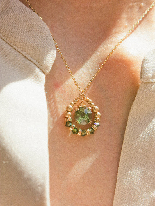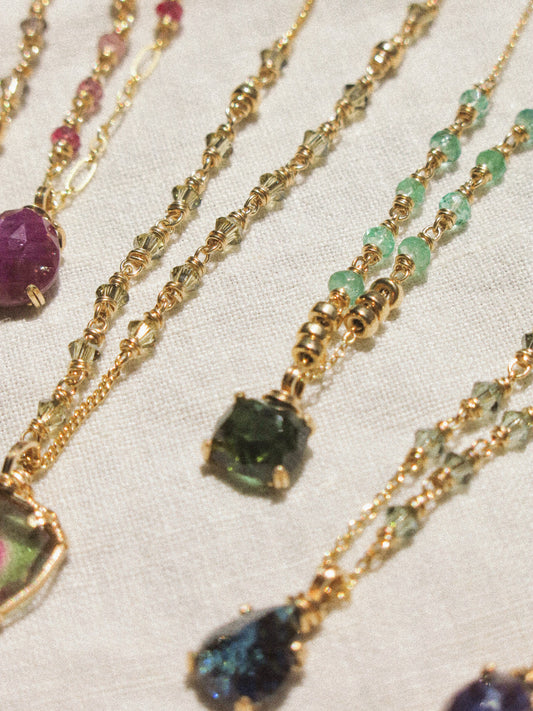 Suila Necklace in Prong Set Rose Cut Light Green Tourmaline with Swarovski Crystal, 14K Gold Fill, 16”