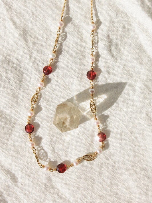 Mozambique Garnet and White Round Pearl Short Necklace with Filigree Links