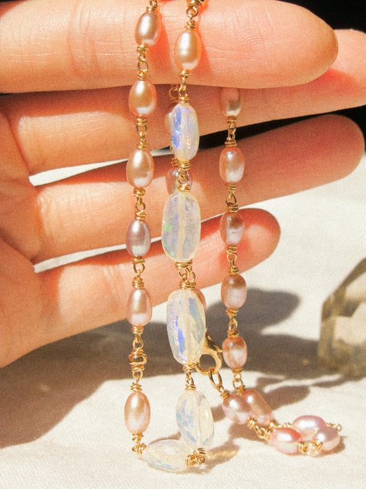 Rainbow Rice Pearl and Faceted Ethiopian Opal Nugget Delicate Choker Necklace