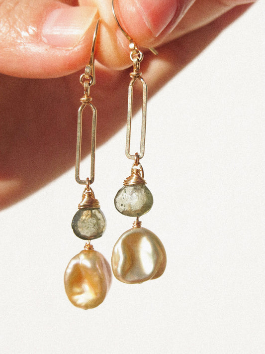 Golden Keshi Pearl and Faceted Moss Aquamarine Briolette on Rectangle Frame Dangle Earrings in 14K Gold Ill, March and June Birthstone