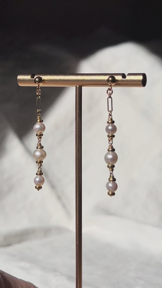 White Pearl Trio Cascading Post Earrings, 14K Gold Fill