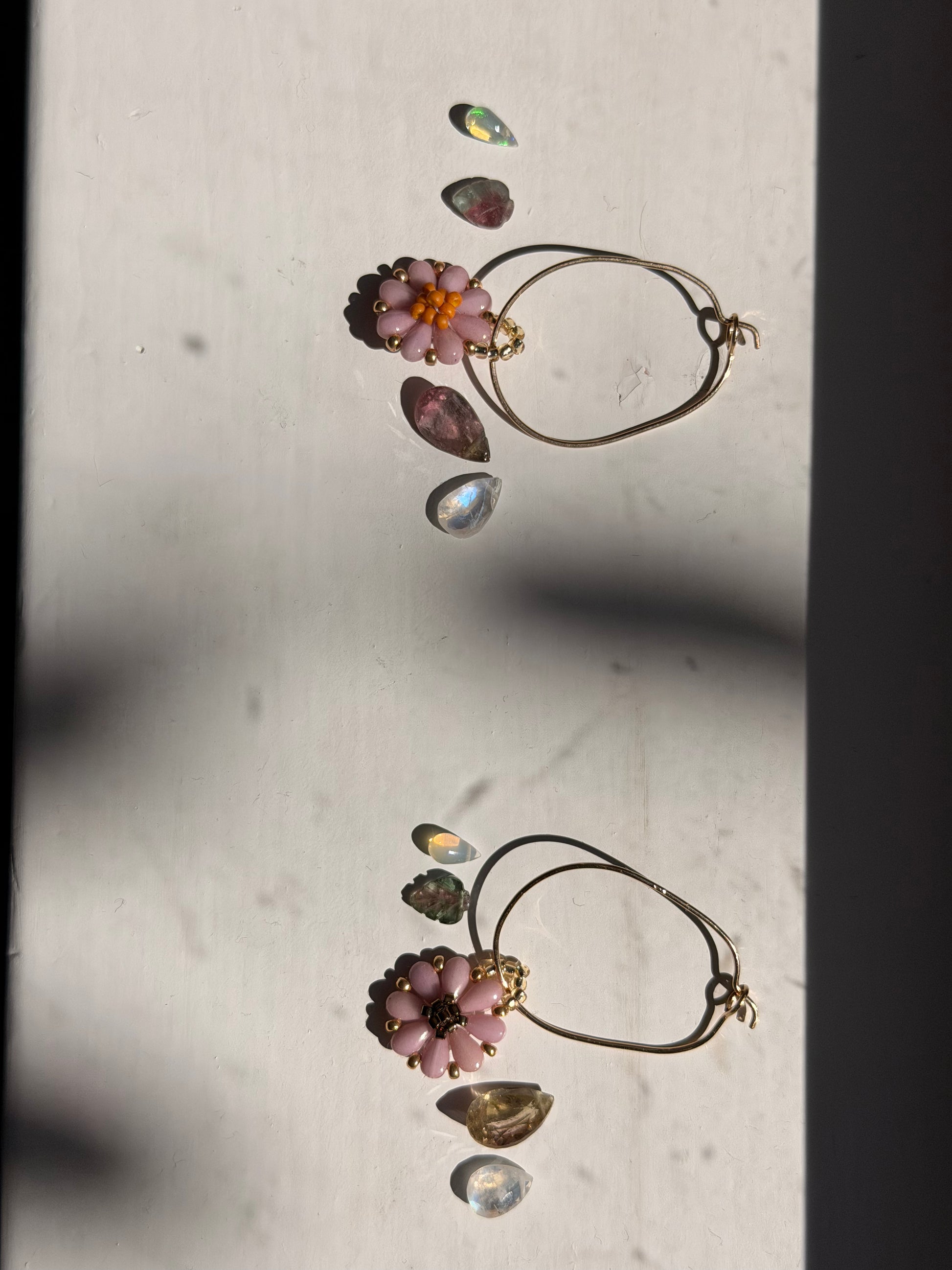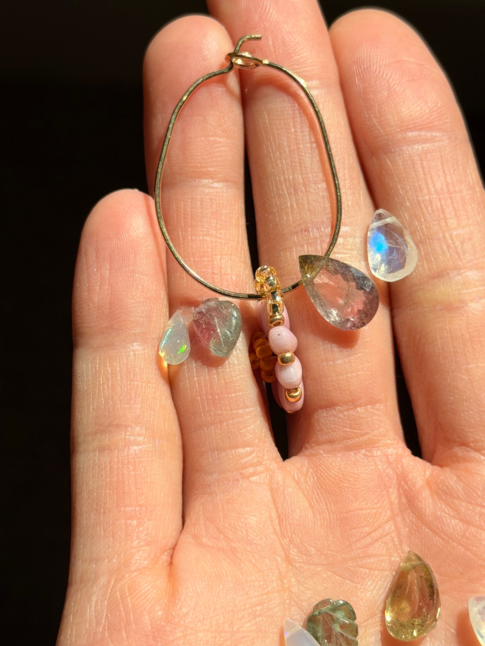 - Gemstone charms, including Ethiopian Opal drops, carved bicolor Tourmaline leaves, bicolor Tourmaline faceted teardrops, and faceted rainbow moonstone teardrops