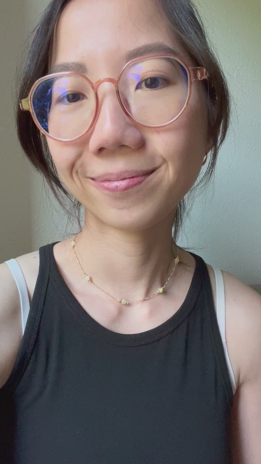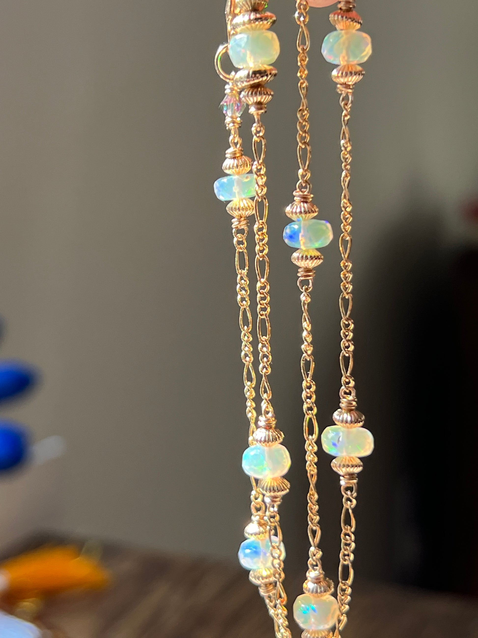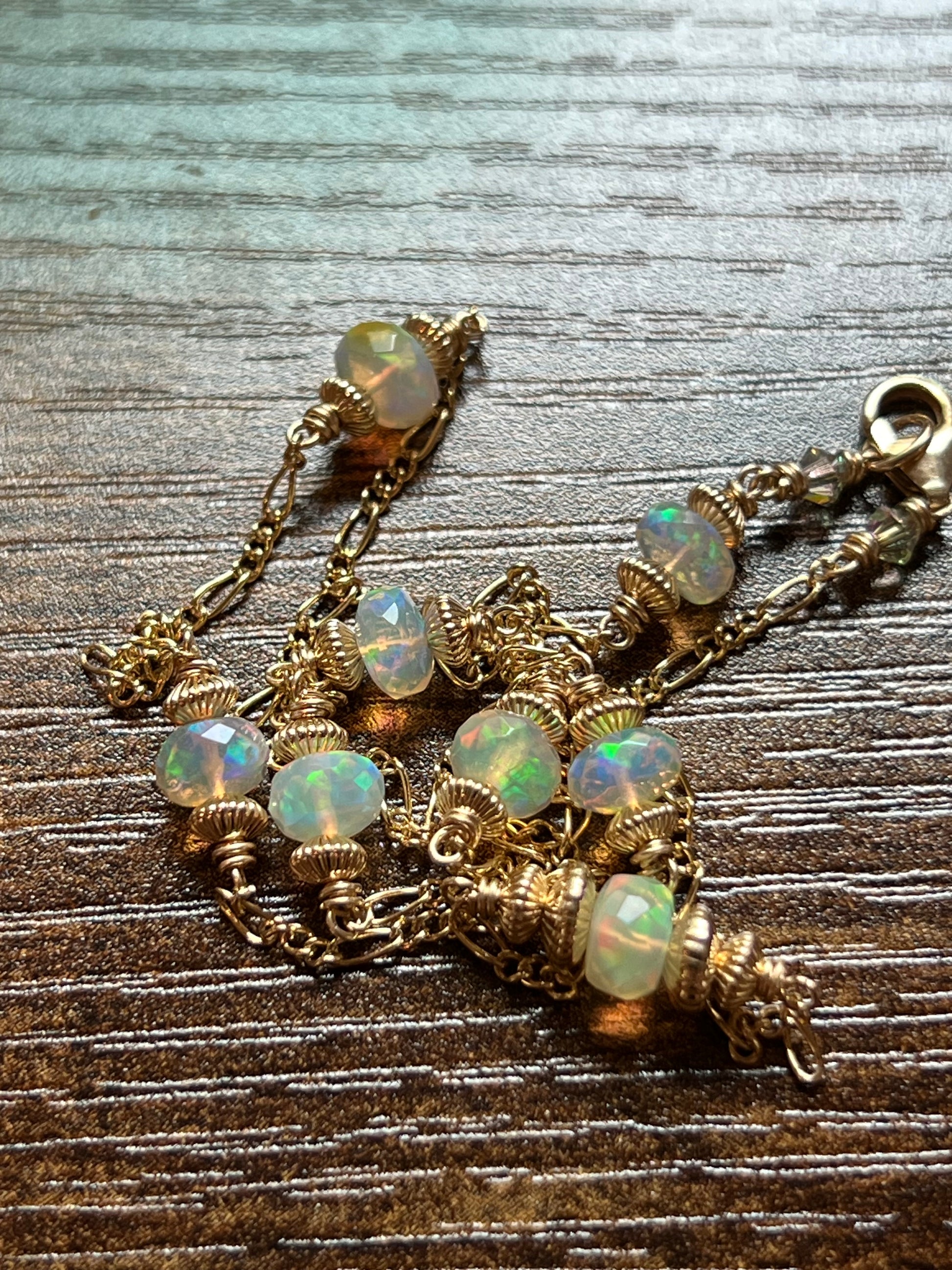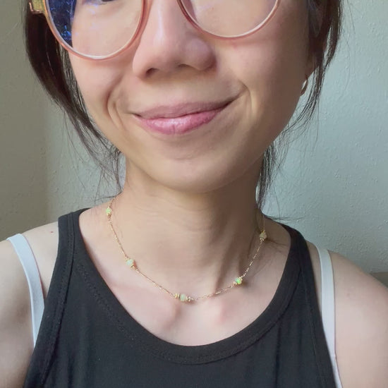 Satellite choker necklace with faceted Welo Opal rondelle and gold fill saucer beads on Figaro chain in 14K yellow gold fill.