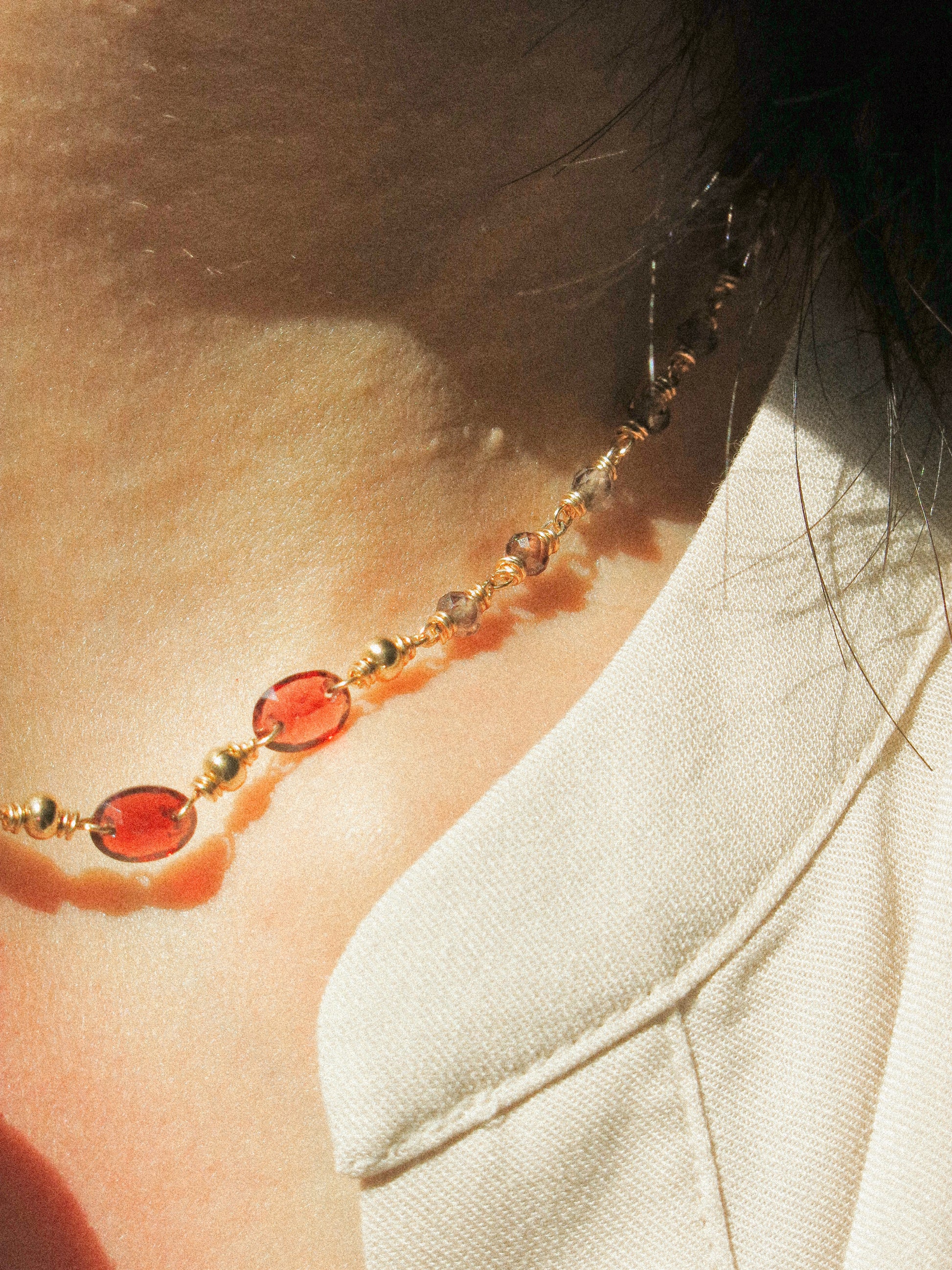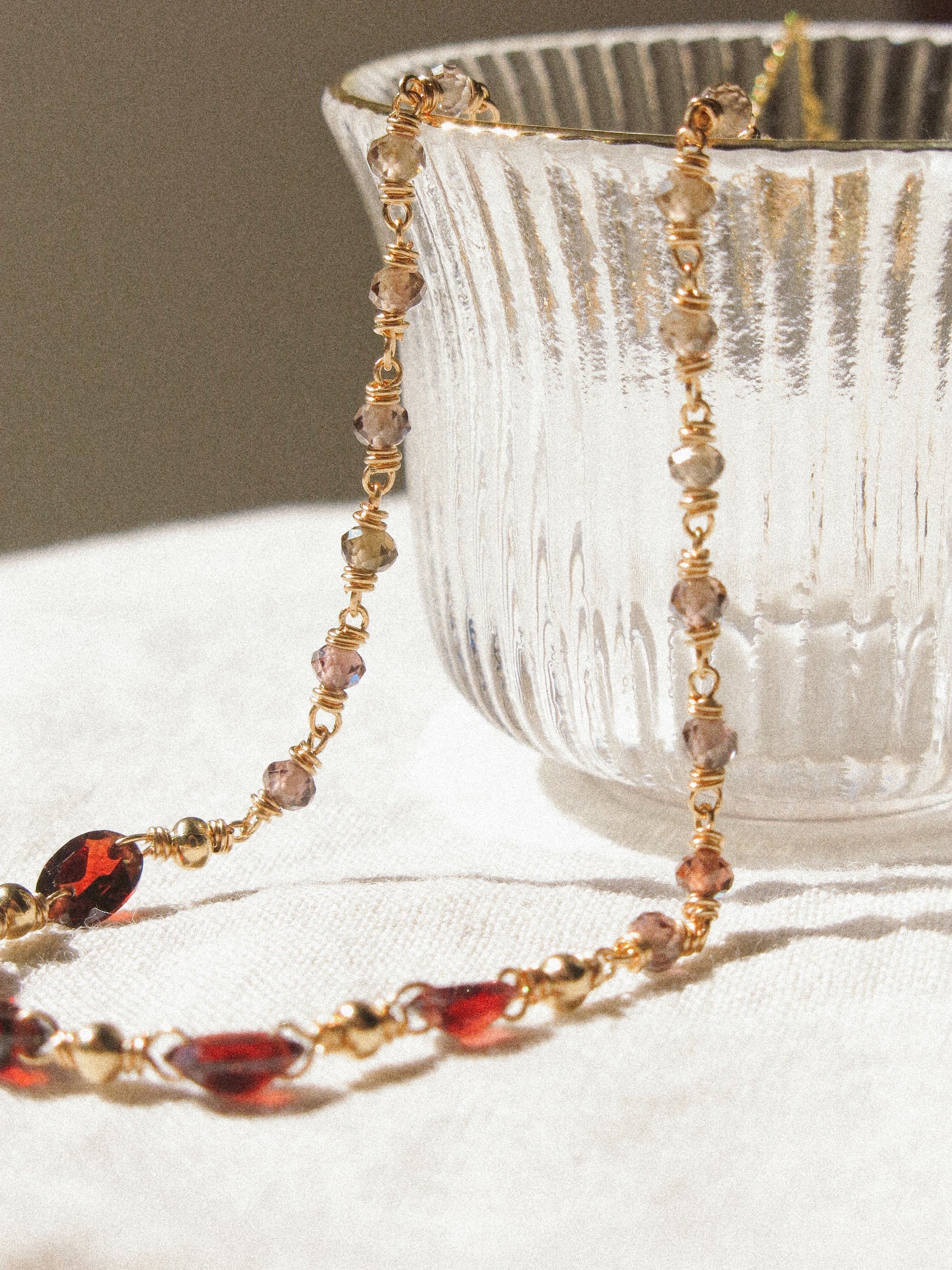 Dress up your neck with this sultry, timeless choker. Made with five faceted Mozambique Garnet ovals and AAA microfaceted Tundra Sapphire in mauve ombré palette. The choker is accented with 14K gold fill beads throughout.