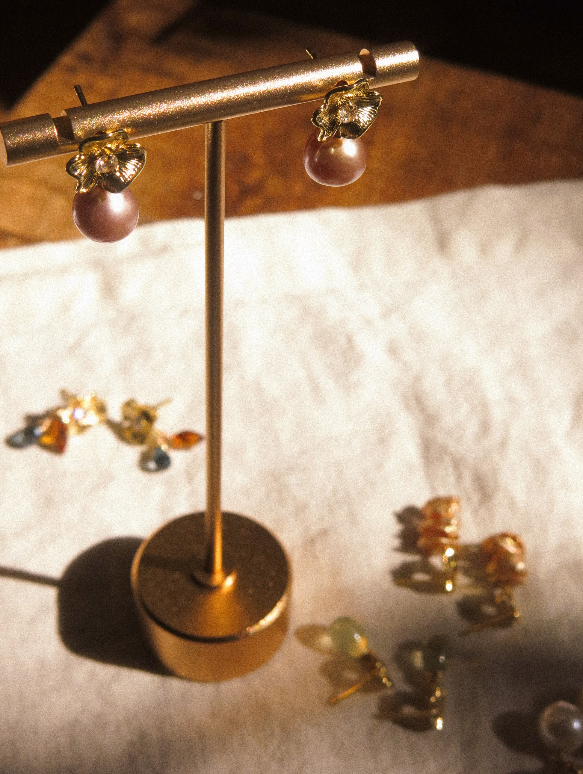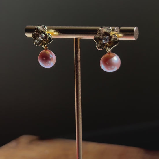 Detailed description: 14K gold plated three-petal flower post earrings with CZ center and sterling silver stick. The earrings feature a round mauve purple Edison pearl dangling below the flower. The wire used on the pearls is 14K gold fill.