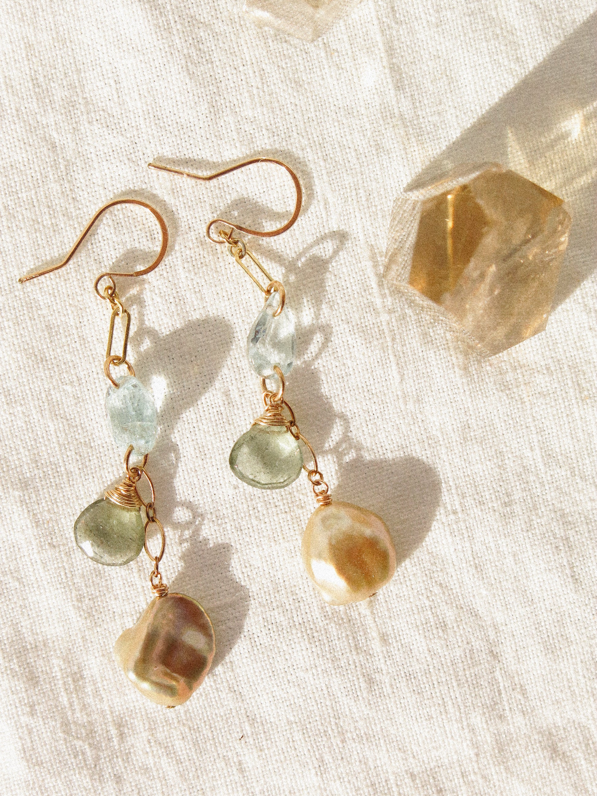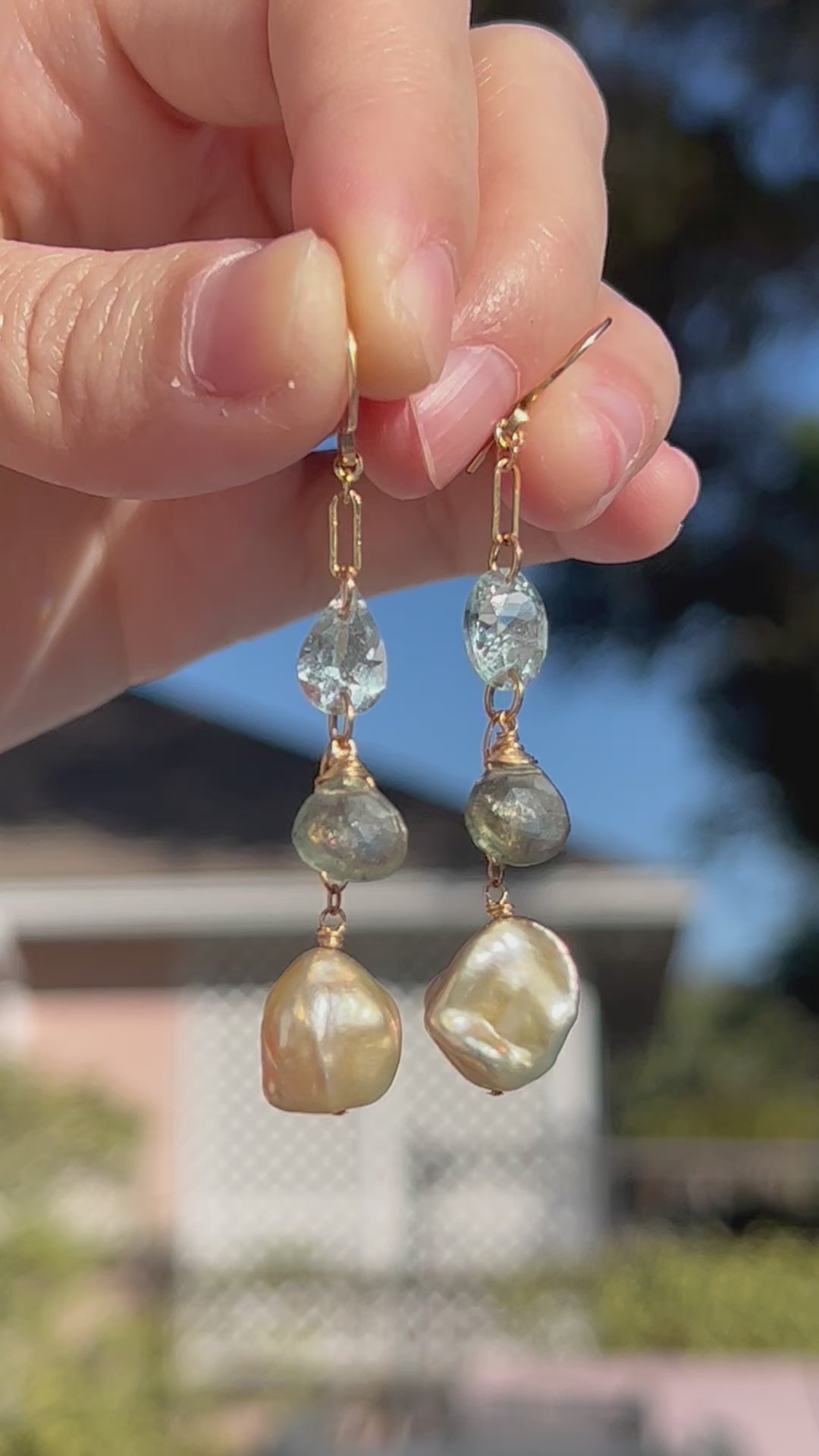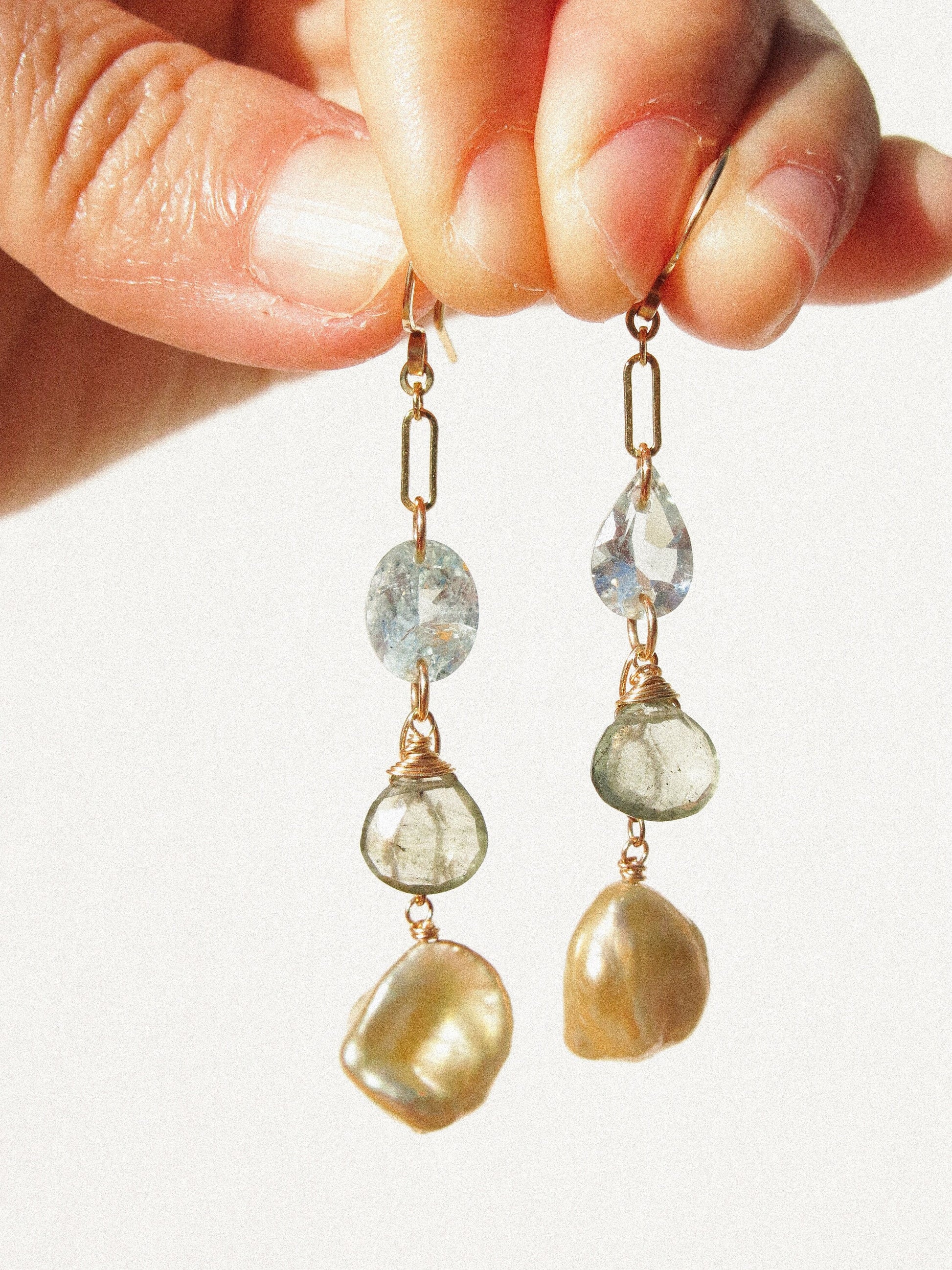 Faceted Aquamarine, faceted Moss Aquamarine heart, and golden champagne Keshi pearl carefully draped to show the gentle gradual change in color and opacity. I carefully ensured that each gemstone had equal distance apart. The Aquamarine on the top are intentionally chosen with different shapes to match the visual weight of Keshi pearls’ organic shape at the bottom. Entirely handcrafted in 14K gold fill. This is the statement earrings that you can wear everyday!