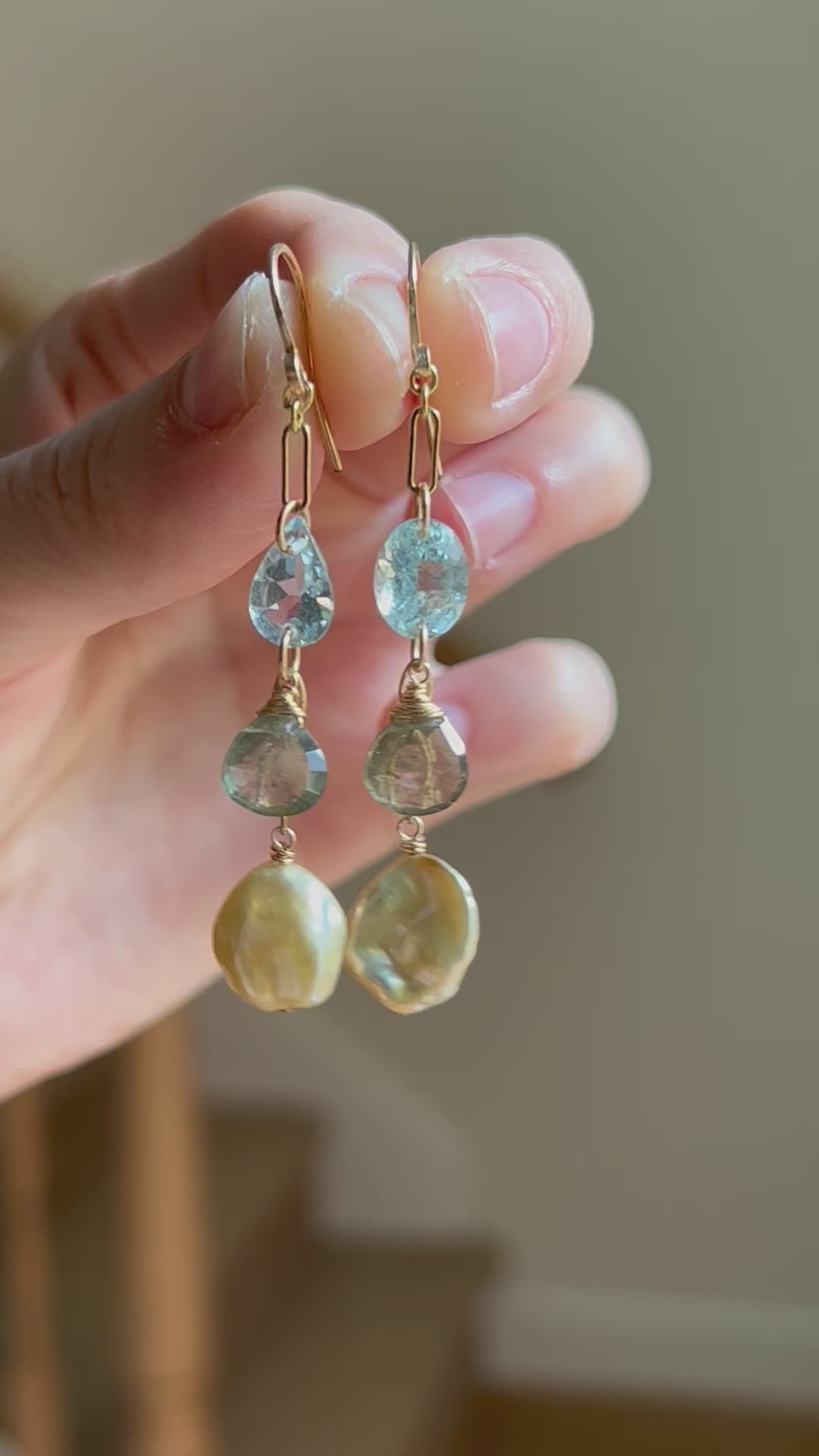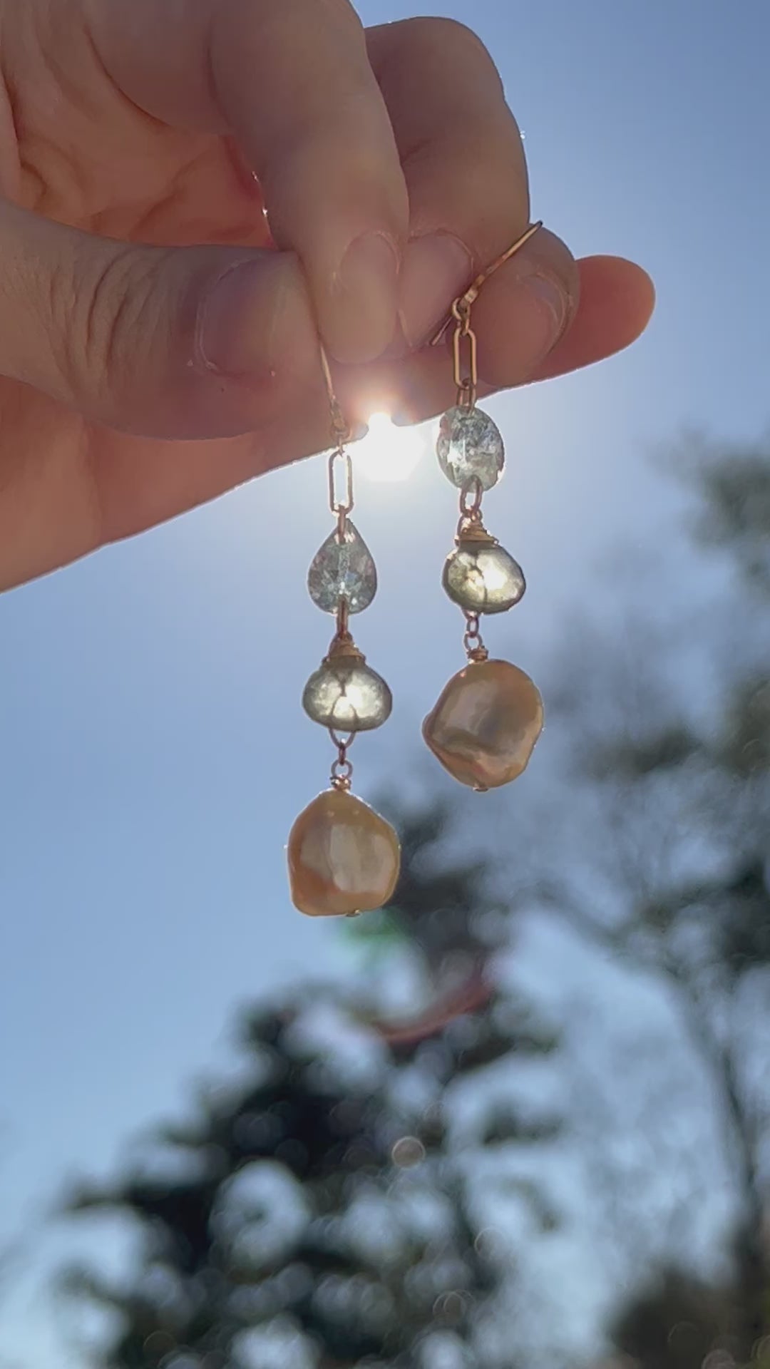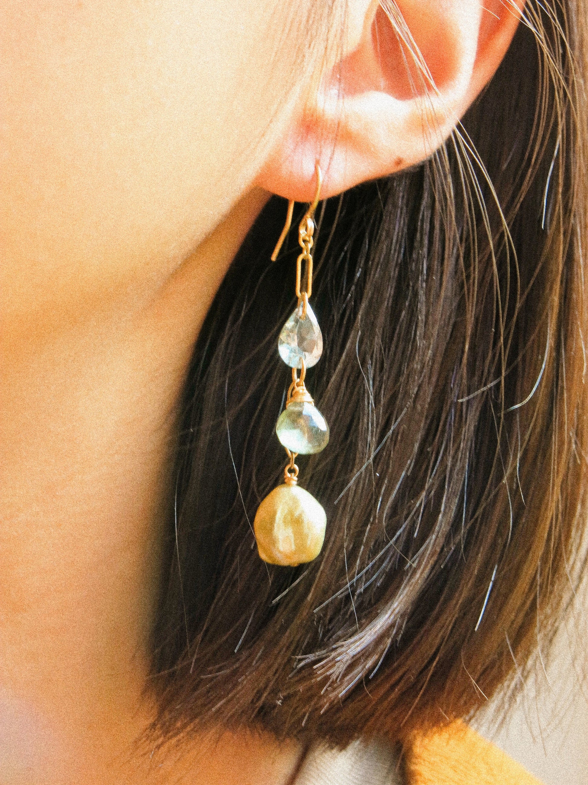 Faceted Aquamarine, faceted Moss Aquamarine heart, and golden champagne Keshi pearl carefully draped to show the gentle gradual change in color and opacity. I carefully ensured that each gemstone had equal distance apart. The Aquamarine on the top are intentionally chosen with different shapes to match the visual weight of Keshi pearls’ organic shape at the bottom. Entirely handcrafted in 14K gold fill. This is the statement earrings that you can wear everyday!