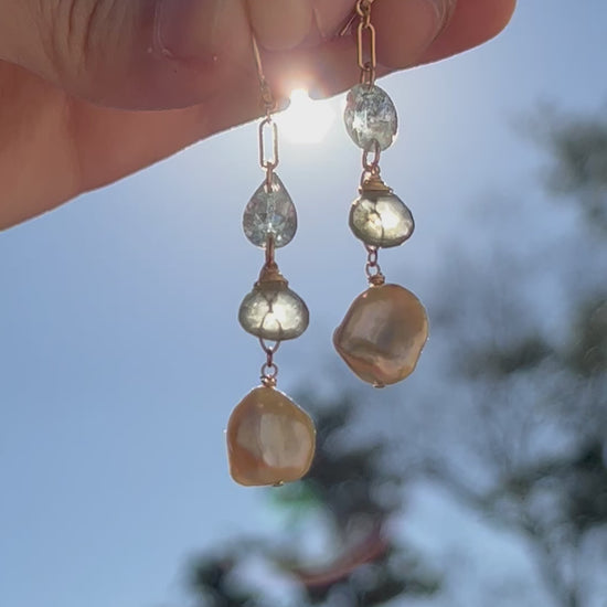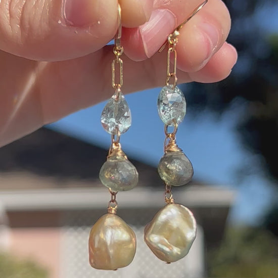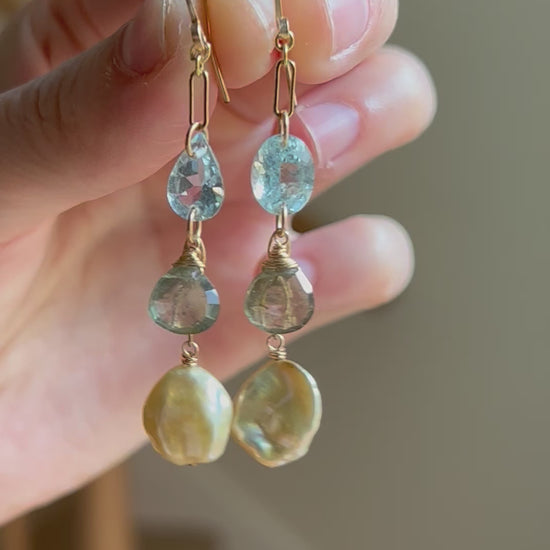 Golden Keshi Pearl, Faceted Aquamarine, and Faceted Moss Aquamarine Briolette Dangle Earrings in 14K Gold Ill, March and June Birthstone