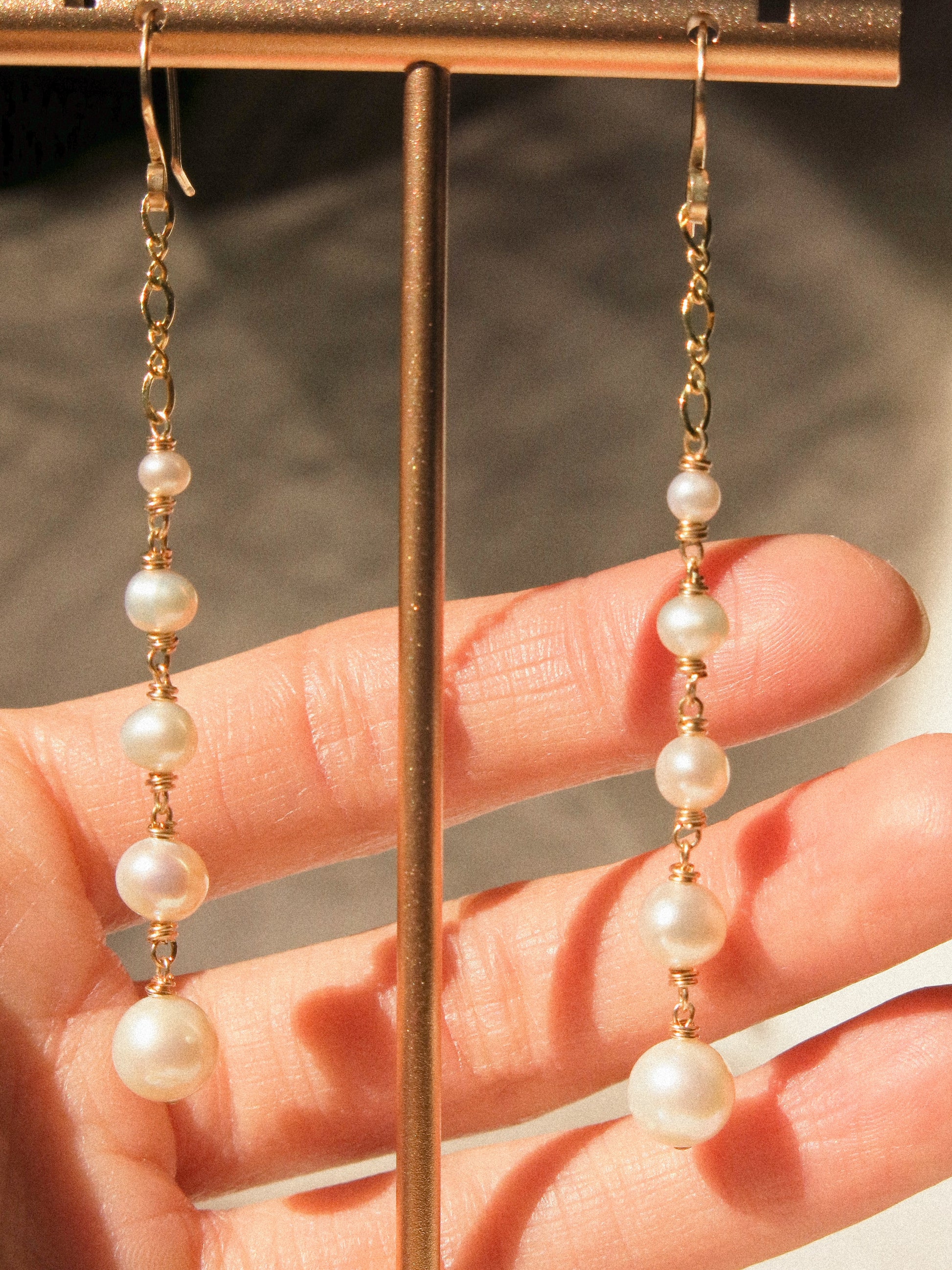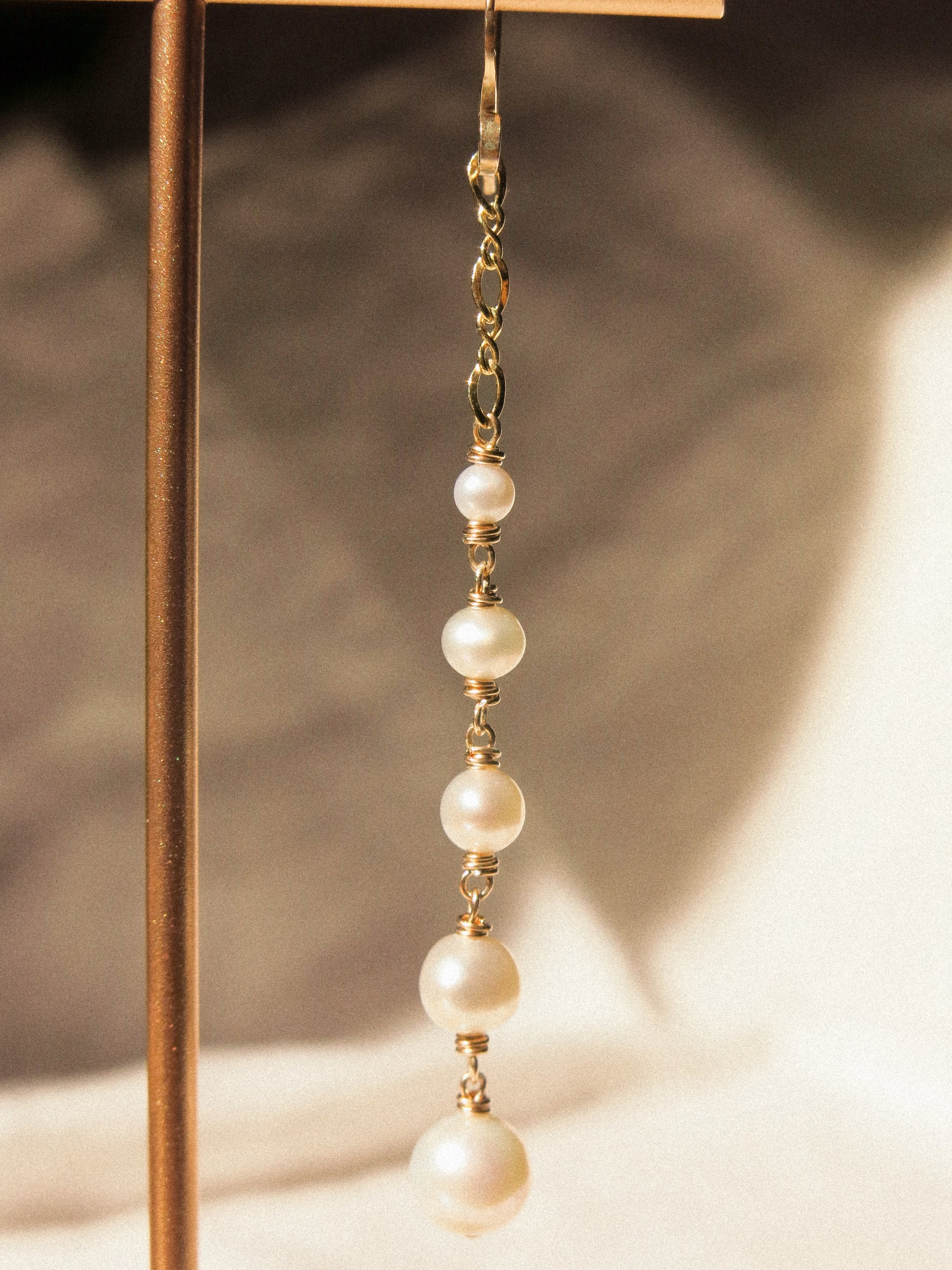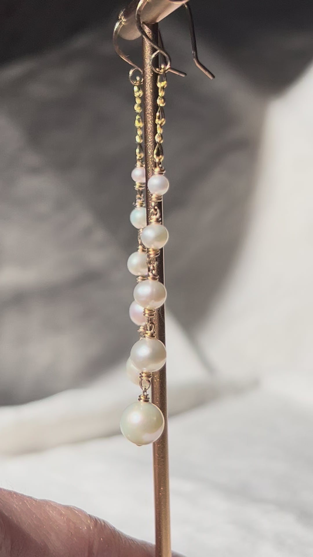 Detailed description: The earrings feature 5 white pearls in graduated sizes. Completed with the figure 8 chain connecting the pearls and the French ear wire. Entirely handmade in 14K gold fill.