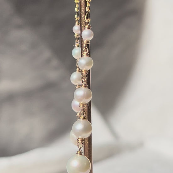 Graduated White Pearl Cascading Earrings with Figure 8 Chain, 14K Gold Fill