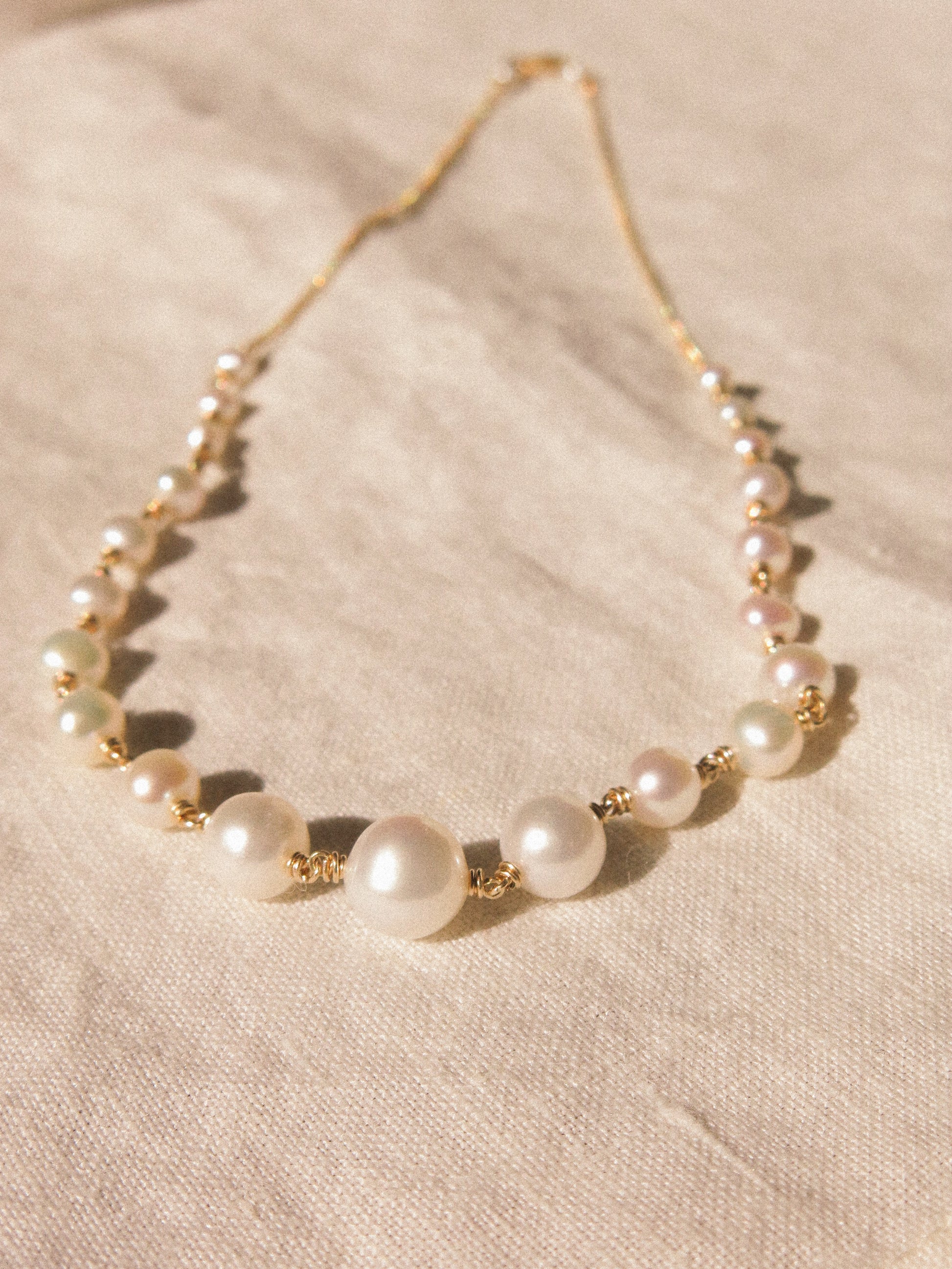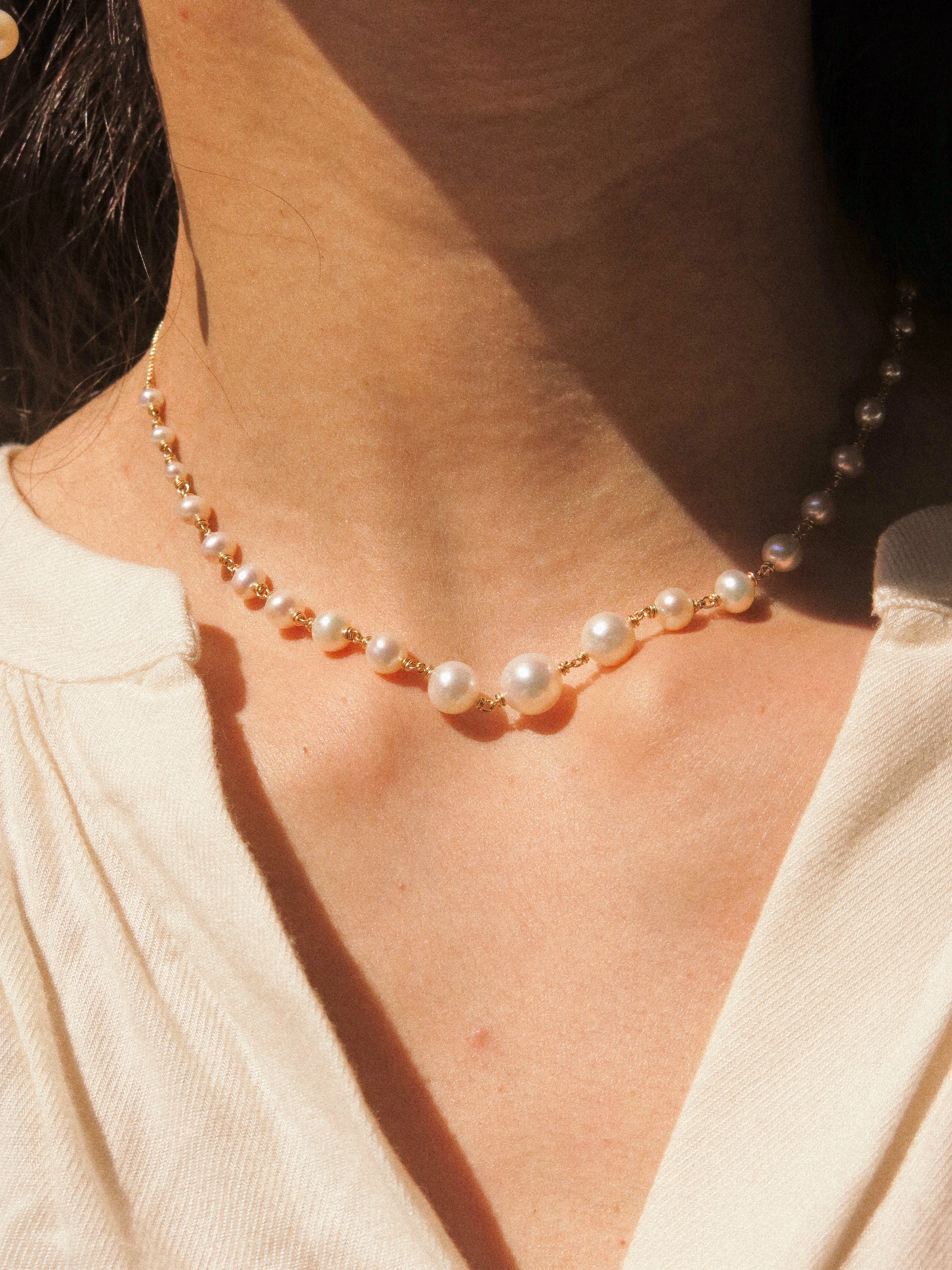 Detailed description: The necklace features hand-wrapped graduated whit round pearls. The largest round Edison pearl at the center measures 9 mm. The 14.5" choker is completed with curb chain for a sleek and dainty look. Bridal, night out, gala, cocktail party. Ideal for all occassions. Entirely handmade in 14K gold fill.