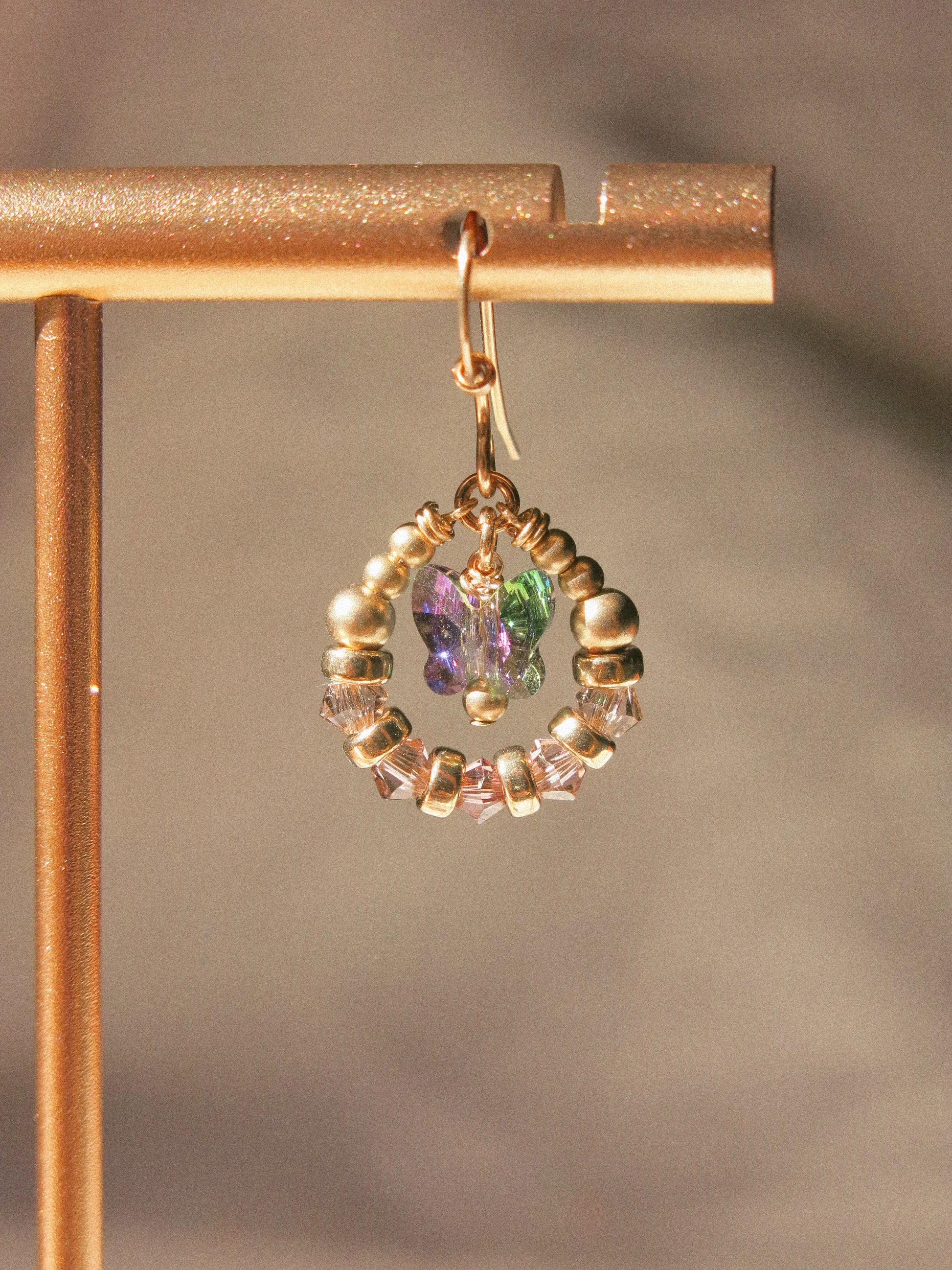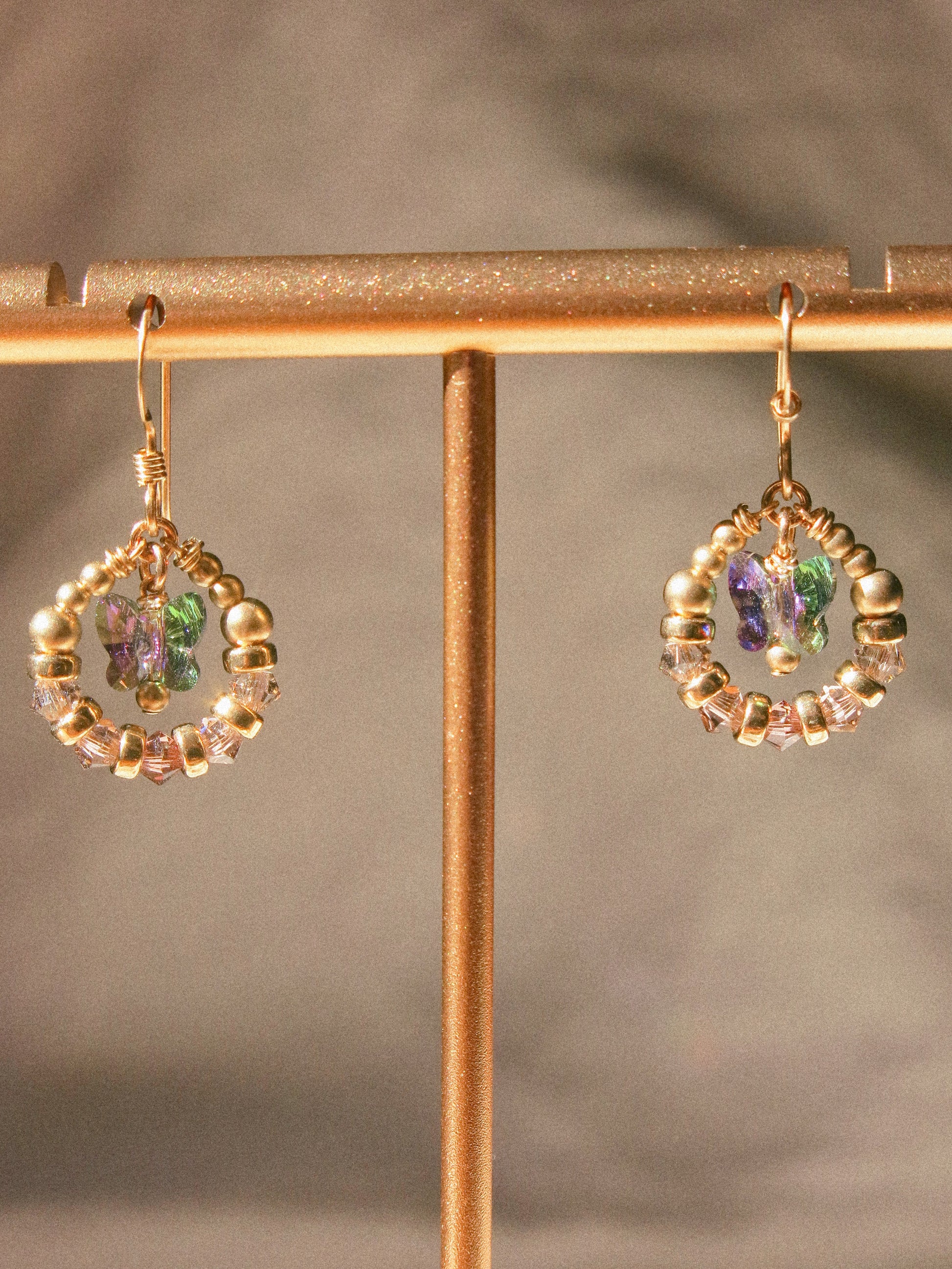 Detailed description: The earrings feature our signature Suila design - an intricate frame of 14K gold fill beads and ombré lavender Swarovski crystals haloing a Swarovski crystal butterfly in mystic peacock at the center. Completed with French ear wire for easy wear. Entirely handmade in 14K gold fill.