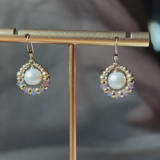 Detailed description: The earrings feature our signature Suila design - an intricate frame of 14K gold fill beads and gold champagne Swarovski crystals haloing the lustrous white round pearl at the center. Completed with French ear wire for easy wear. Entirely handmade in 14K gold fill.