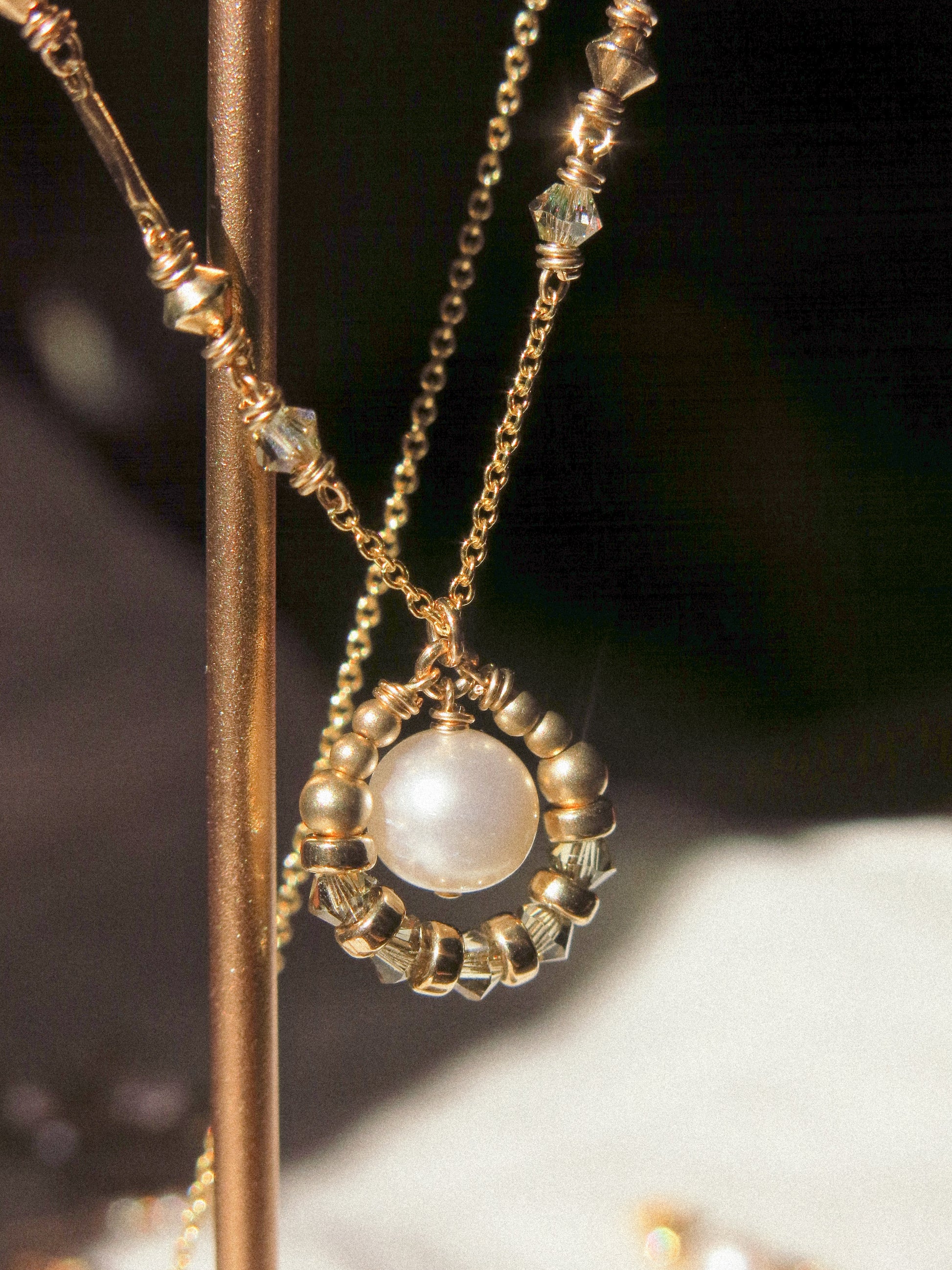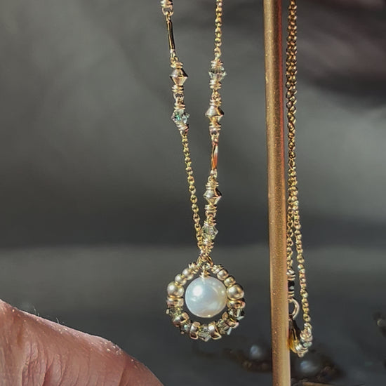Detailed description: The necklace features our signature Suila design - an intricate frame of 14K gold fill beads and muted silver green Swarovski crystals haloing the lustrous white round pearl at the center. The necklace is completed with hand-wrapped accent chain using mystic peacock Swarovski crystals, bicone beads, and dapped bar components. Entirely handmade in 14K gold fill.