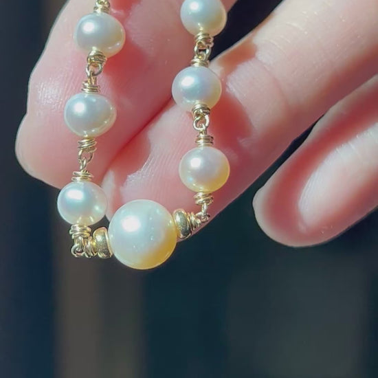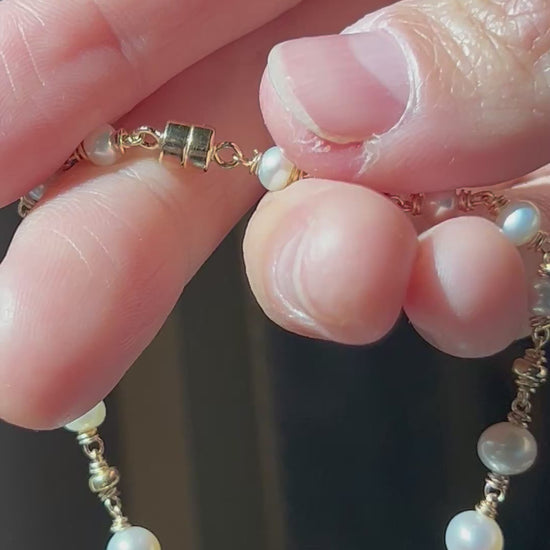 White Pearl and Rondel Bead Wire Wrapped Bracelet with Magnetic Clasp, 6.5”, 14K Gold Fill