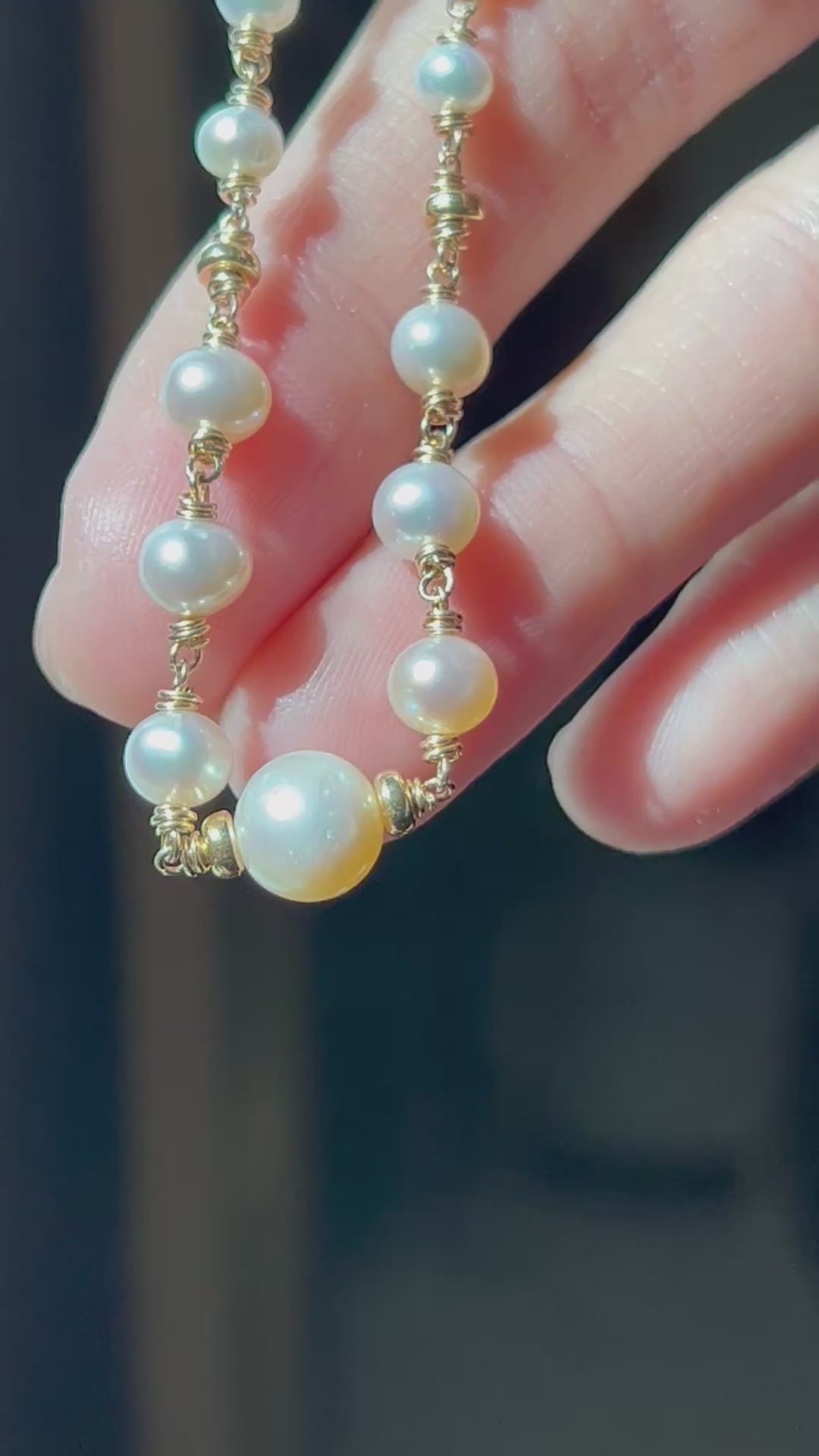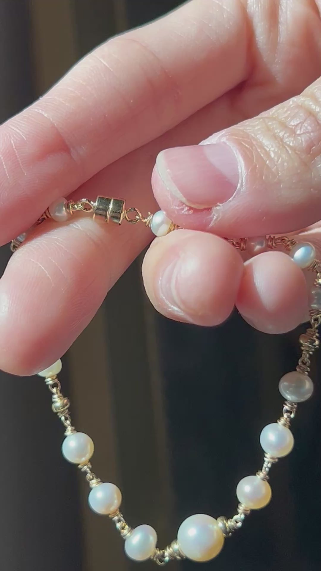 Detailed description: The bracelet features hand-wrapped white pearls, with a round white pearl at the center hugged by two gold-filled rondelle beads. Completed with a magnetic clasp for easy wear and a smooth feel. Entirely handmade in 14K gold fill.